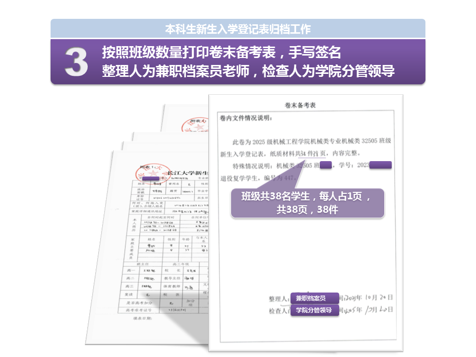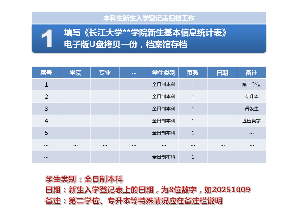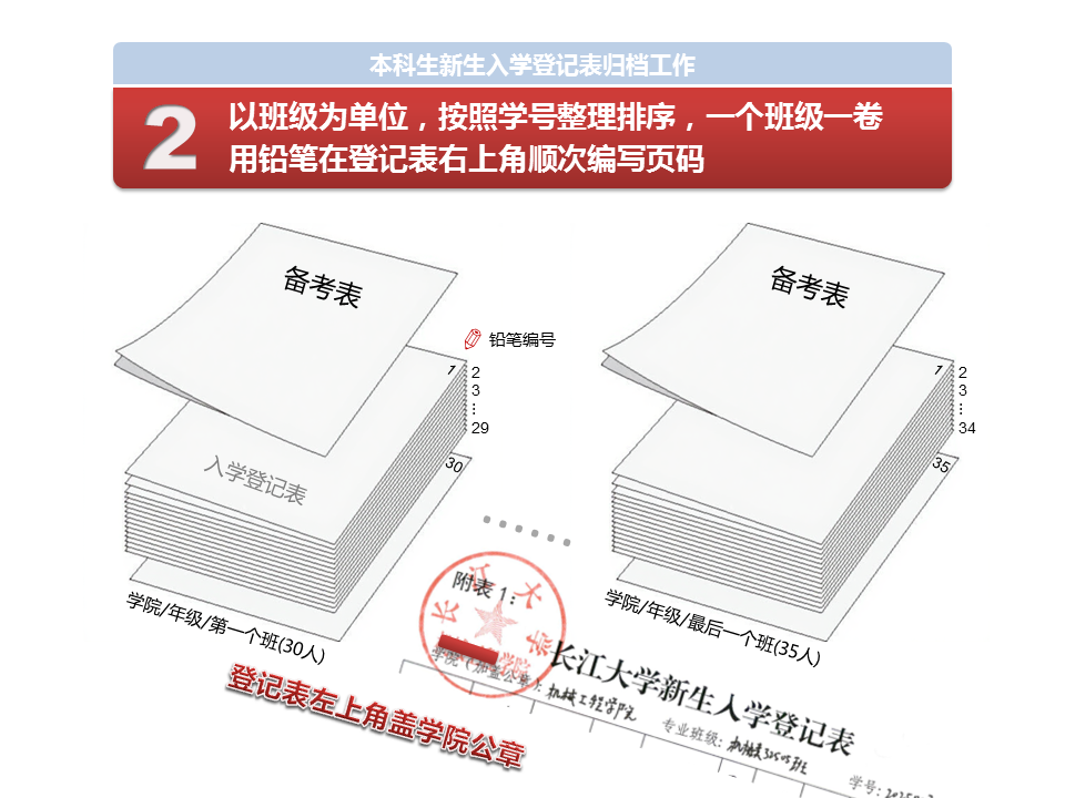 2.归档材料记录内容完整准确,字迹工整清晰,签字盖章手续完备,印章清晰完整,具体归档流程及要求见《长江大学新生入学登记表归档指南》(附件1)。