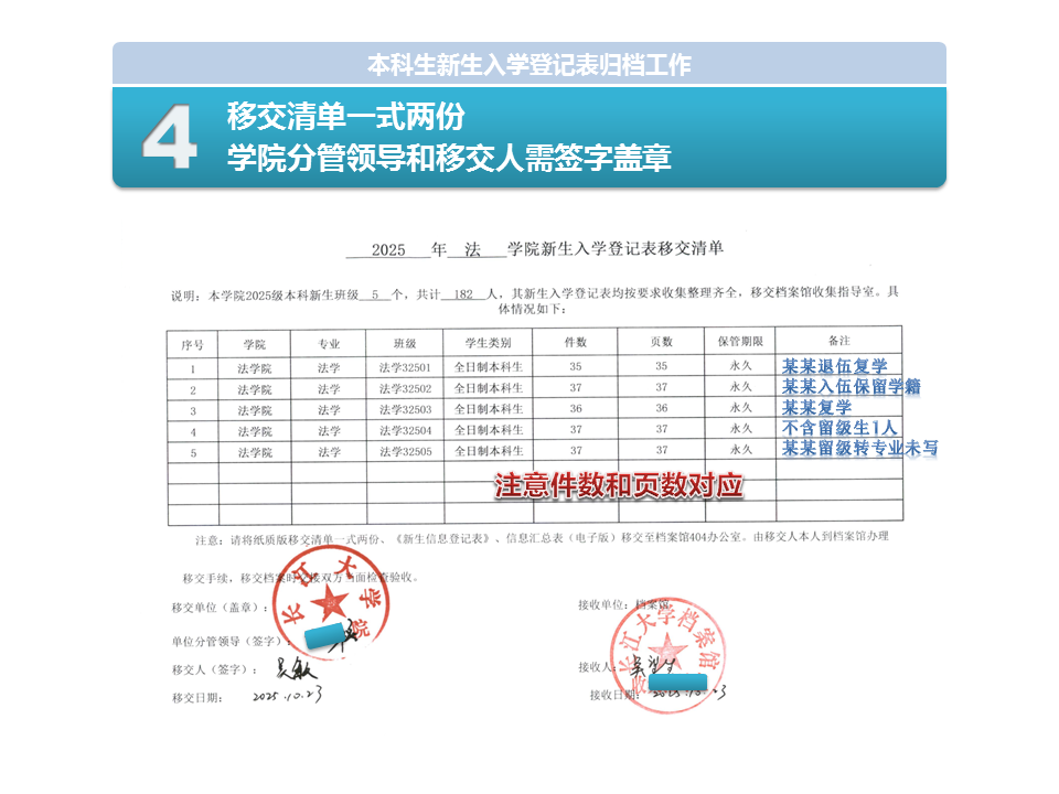 纸质版:分班整理铅笔编号,学院公章完备的《长江大学新生入学登记表》纸质版和卷末备考表(附件3),及一式两份的移交清单(附件4)移交到档案馆404办公室。